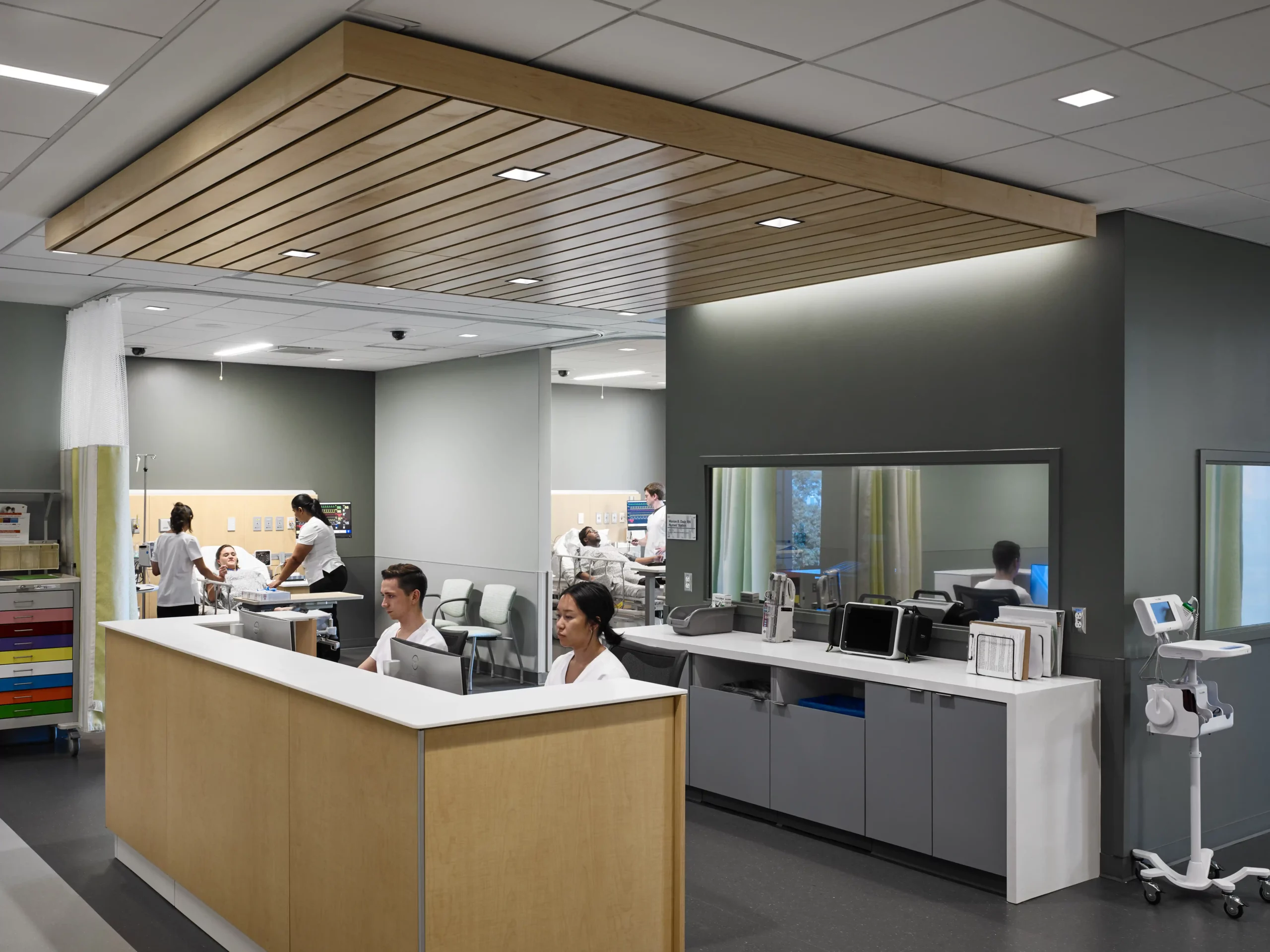 In association with Architect-of-Record Perkins + Will, JMT Architecture led the planning and design of the simulation and skills labs spaces. These purpose-designed spaces suit each specialty, from home care to pediatrics to an OT-focused makerspace. The highlight of the lab spaces is the immersive simulation corridor, which uses fixtures, finishes, and layout informed by research of real hospitals.