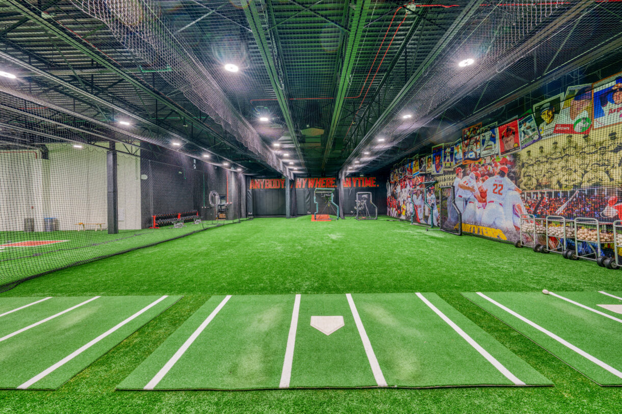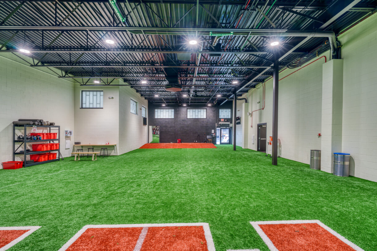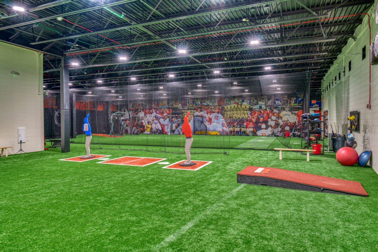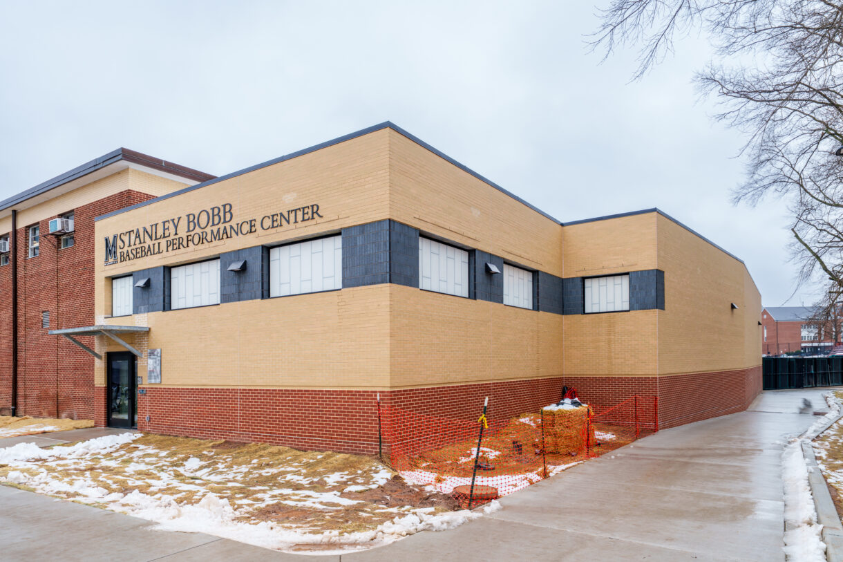 JMT Architecture’s design provides three player practice areas: two pitching lanes with pitching mounds, three hitting lanes, and a plyometric warm-up area. The 6,925 GSF facility also includes state-of-the-art performance analytics technology with data feeds for wall-mounted displays. Externally, the facility’s façade references the adjacent varsity sports team house, with red brick and a buff-colored water table. Black recessed soldier course panels and translucent exterior wall panels break up the elevations and allow natural light into the space.
